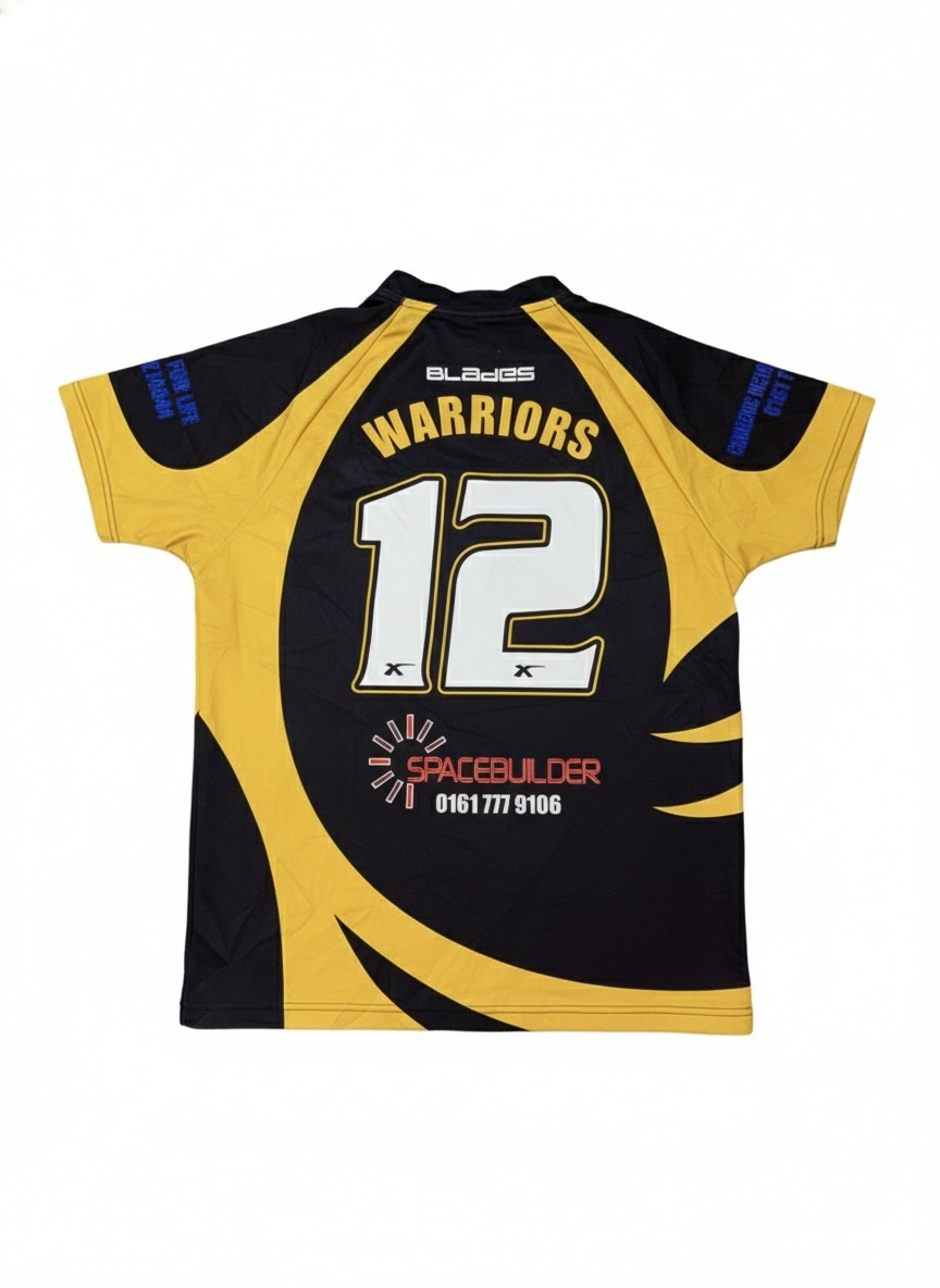 Up for sale is a unique Blades Warriors team jersey featuring high-quality sublimated graphics. This jersey is bold in black and yellow, featuring the number 12 on the back.