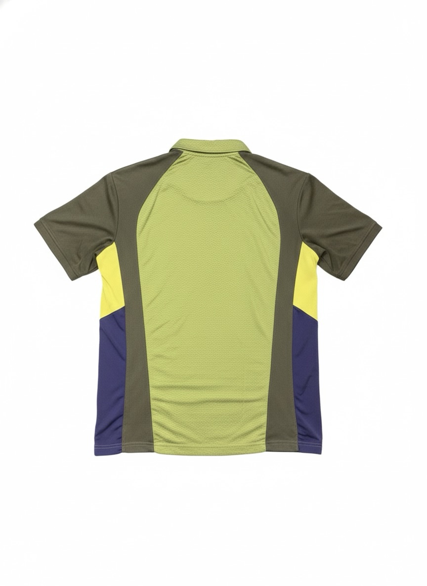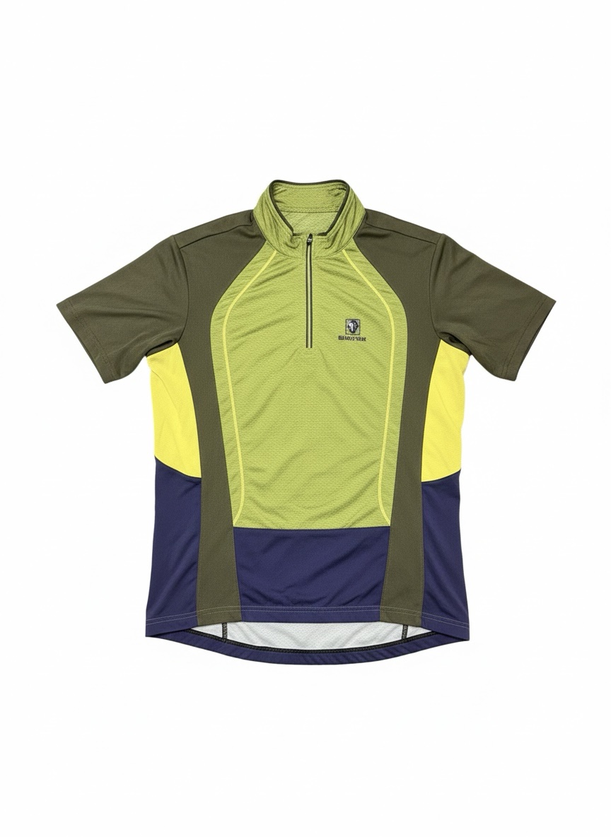 This lightweight quarter-zip athletic jersey is designed for both high performance and style. Featuring a bold, multi-panel design in olive green, lime, yellow, and navy blue, it offers a modern aesthetic for outdoor activities like cycling or running.